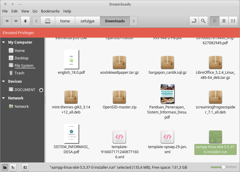 - Pergi dimana file installer XAMPP Linux yang sudah di download sebelumnya;