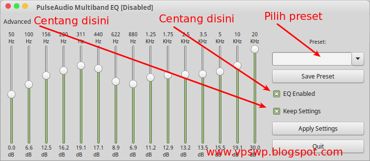 Berikan tanda centang atau check mark pada pilihan Enable Equalizer untuk mengaktifkan equalizer, dan centang Keep Setting untuk menyimpan konfigurasi atau pengaturan equaliser (pengaturan channel atau band) yang sudah kita lakukan.