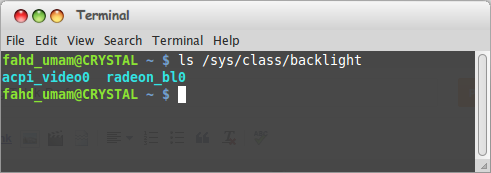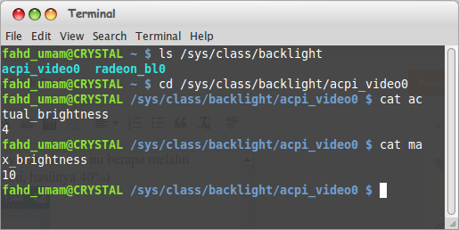 8. Dari percobaan nomor 7, kita tahu bahwa layar yang digunakan oleh laptop Samsung adalah acpi_video0, sehingga kita tidak perlu menguji coba untuk ATI Radeon. Dari sini kita juga bisa mengetahui bahwa nilai brighness saat ini adalah 4 (diwakili oleh applet yang menunjukkan 40%), dan nilai brightness maksimum adalah 10. Hasil ini bisa saja berbeda pada Samsung lain.