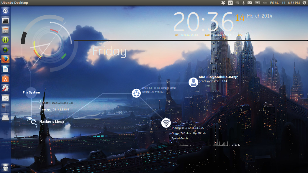 Theme Conky Infinity ini banyak digemari oleh pengguna Linux karena tampilannya desain yang keren. Anda dapat melihat informasi yang ditampilkan seperti kecepatan download upload, jam tanggal, dll.